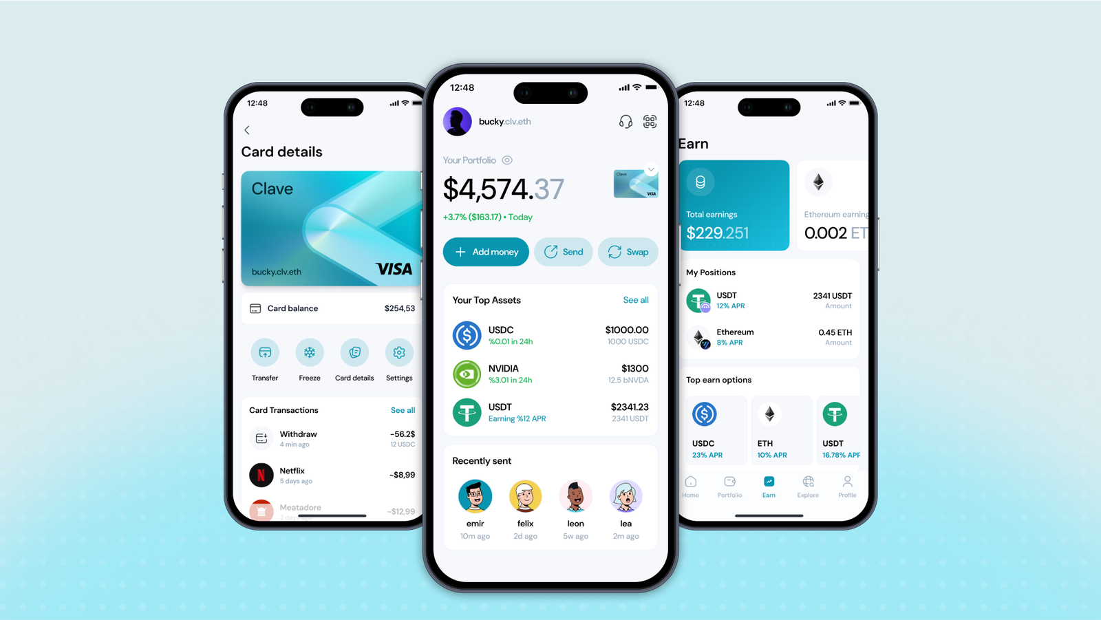 Clave is a neobank challenger built on blockchain rails. Giving any individual across the globe access to stable financial tools at a fraction of the cost of traditional banking apps. Clave utilizes stablecoins, DeFi and smart accounts to offer high interest rate saving products, crypto investing and trading, and a debit card to make spending stablecoins familiar and accessible.